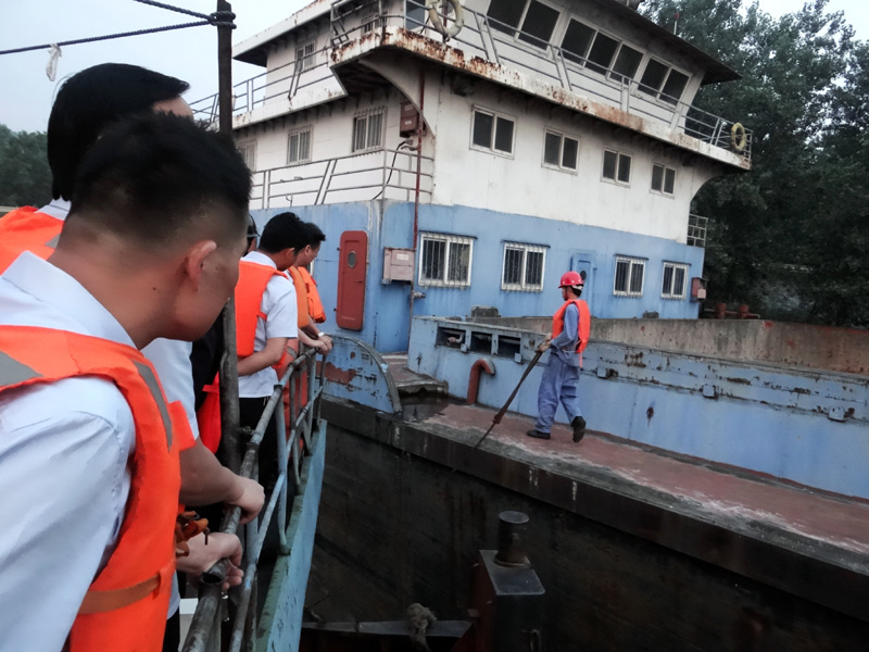 图三:驳船靠近货船,干警准备登船